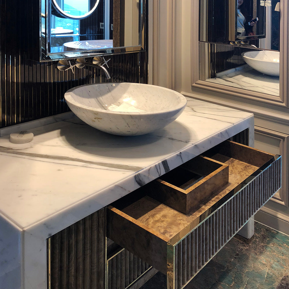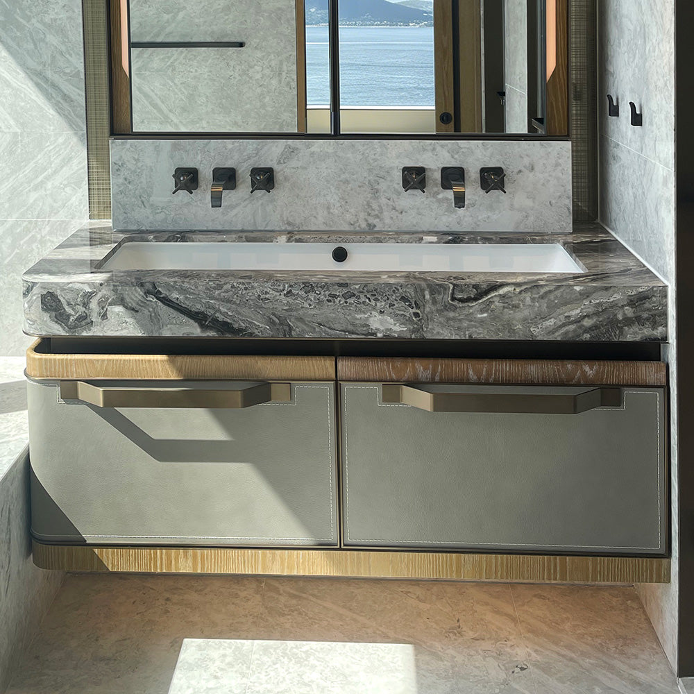 Every cabinet is custom-made to precise dimensions, layouts, and functions. Choose from premium woods, natural stone, lacquered finishes, metals, and hardware, combined with soft-close systems and moisture-resistant construction for elevated daily use.