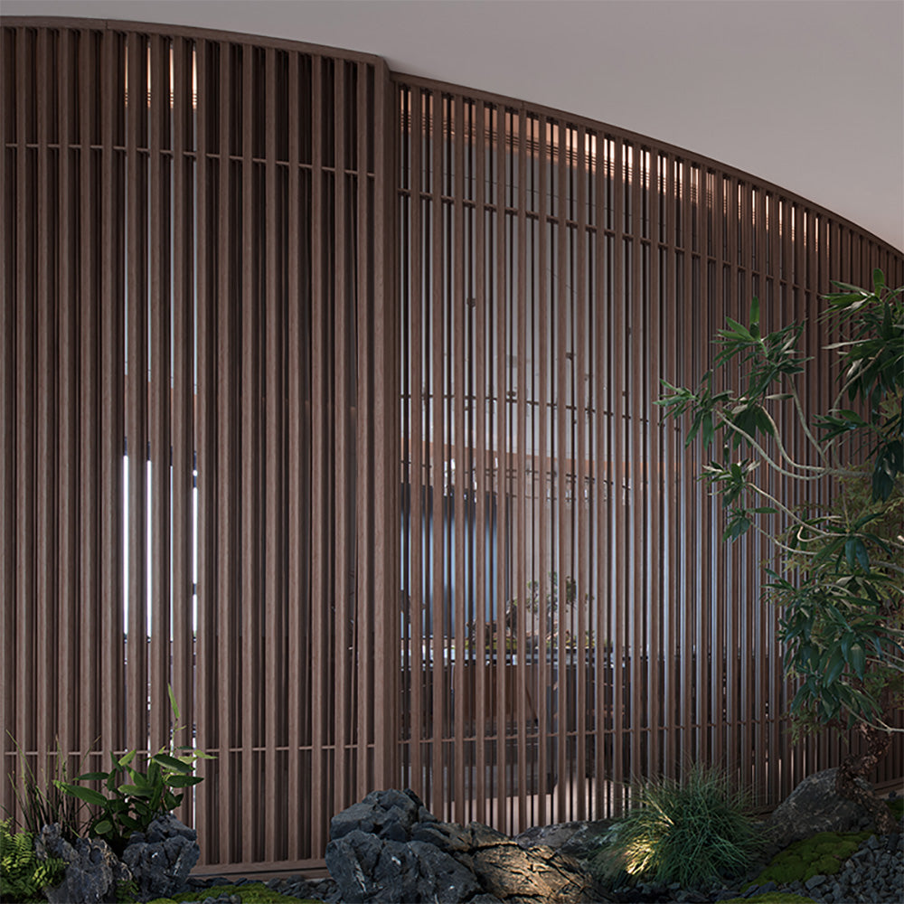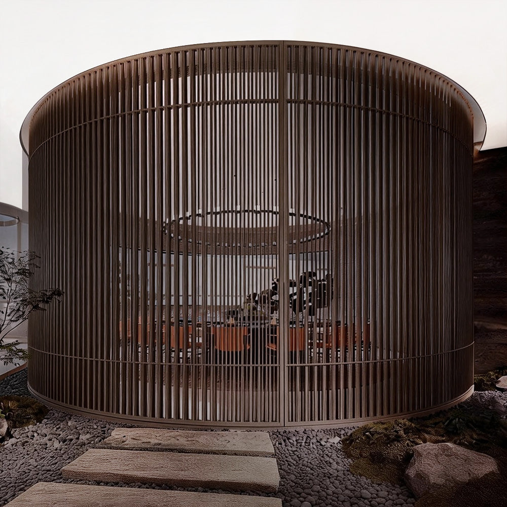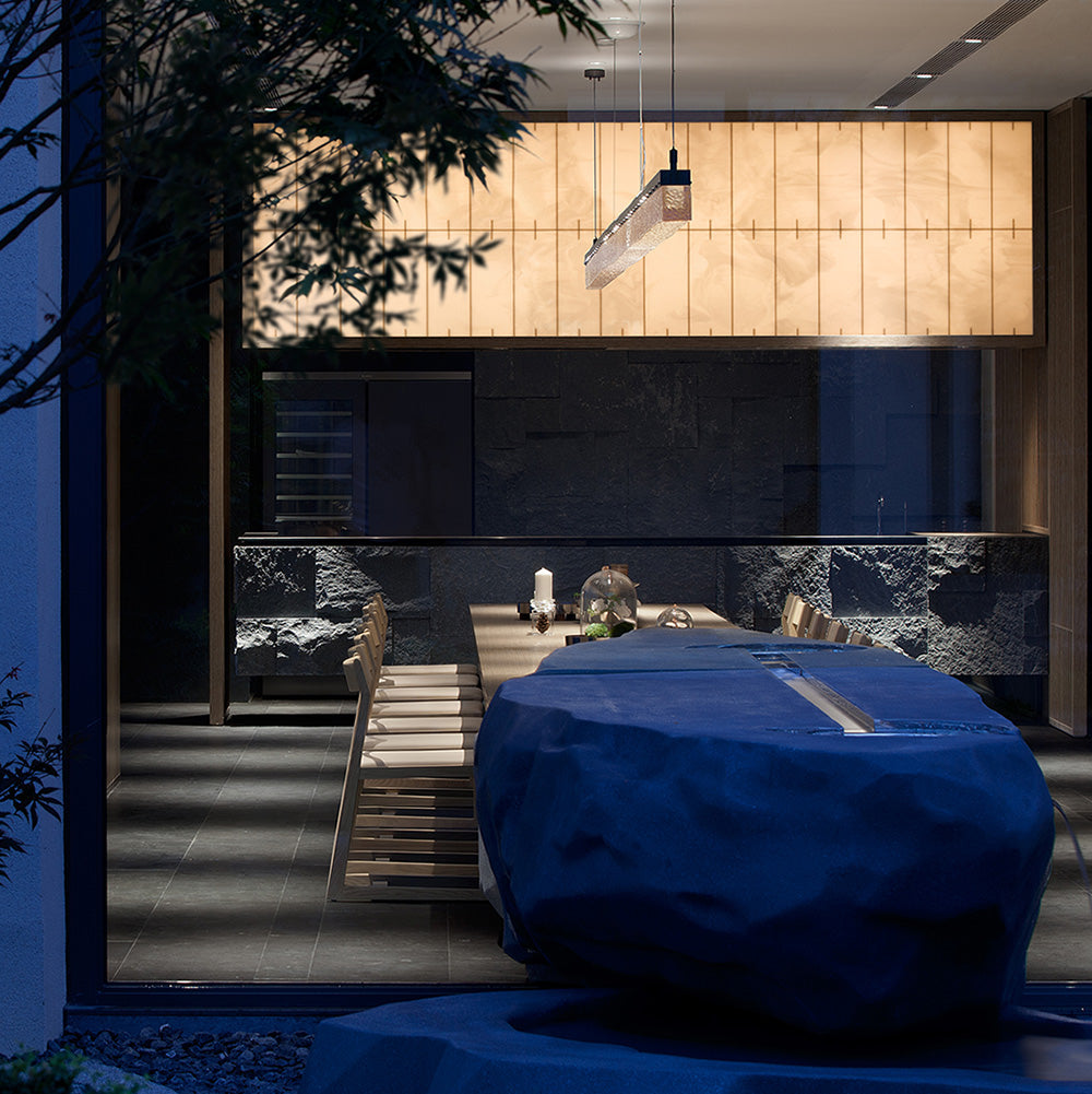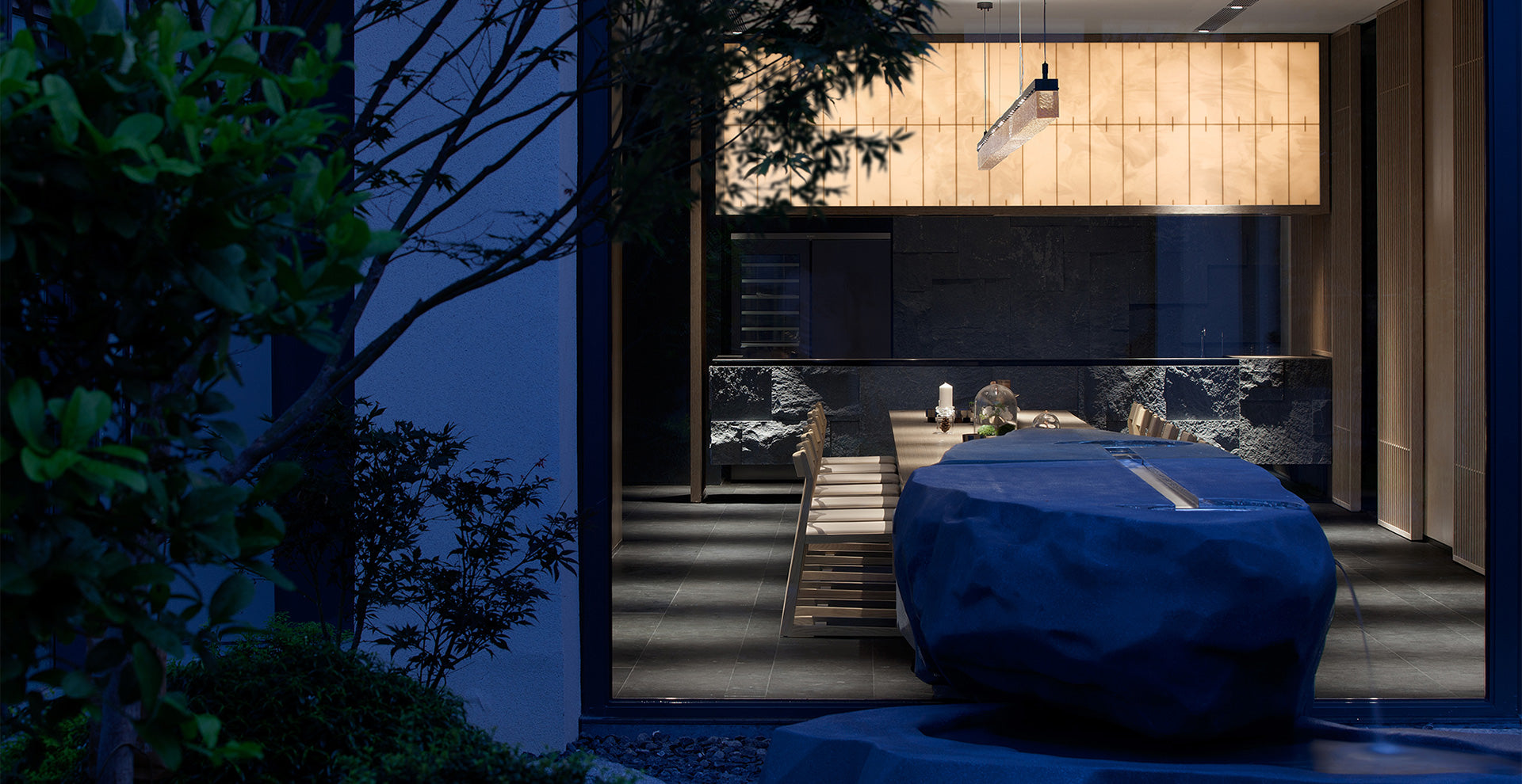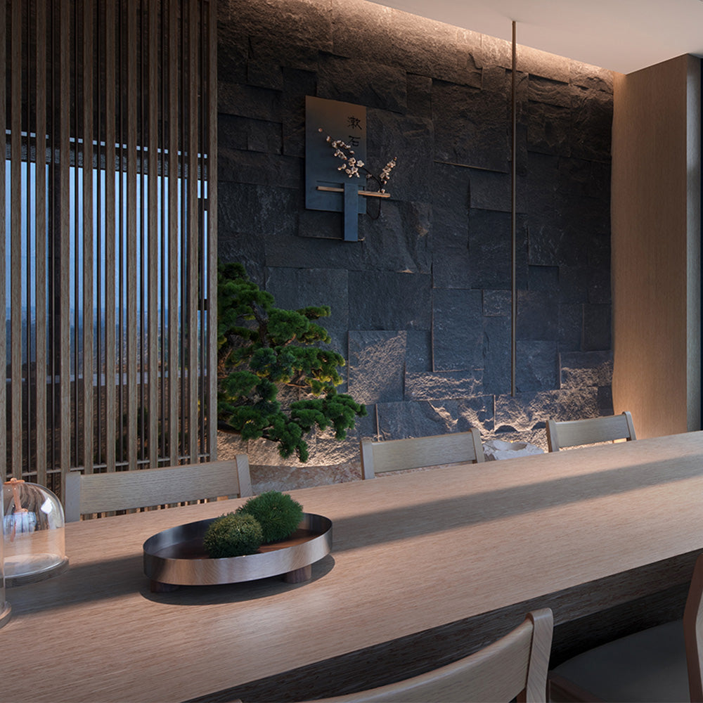 Le sue curve aggraziate e i materiali raffinati creano un'esperienza spaziale immersiva, integrandosi perfettamente con l'ambiente circostante del ristorante.