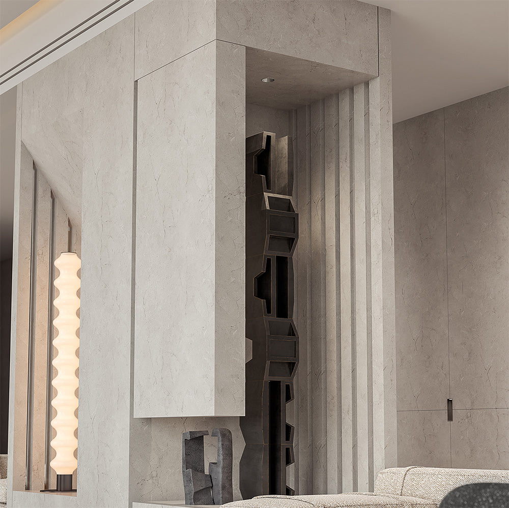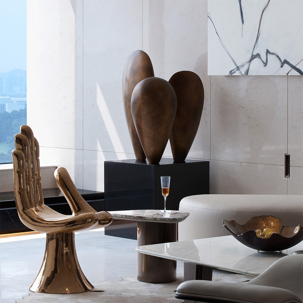 Un design di mobili moderno e lussuoso arricchito da opere d'arte, squisita fattura, design estetico, elementi artistici e spirito umanistico, impreziosito dalla varietà di pelle bianco sporco, pavimento in mattoni blu, teak, terrazzo, vetro smerigliato e vernice metallizzata color rame K1019, ecc. di Dilise.