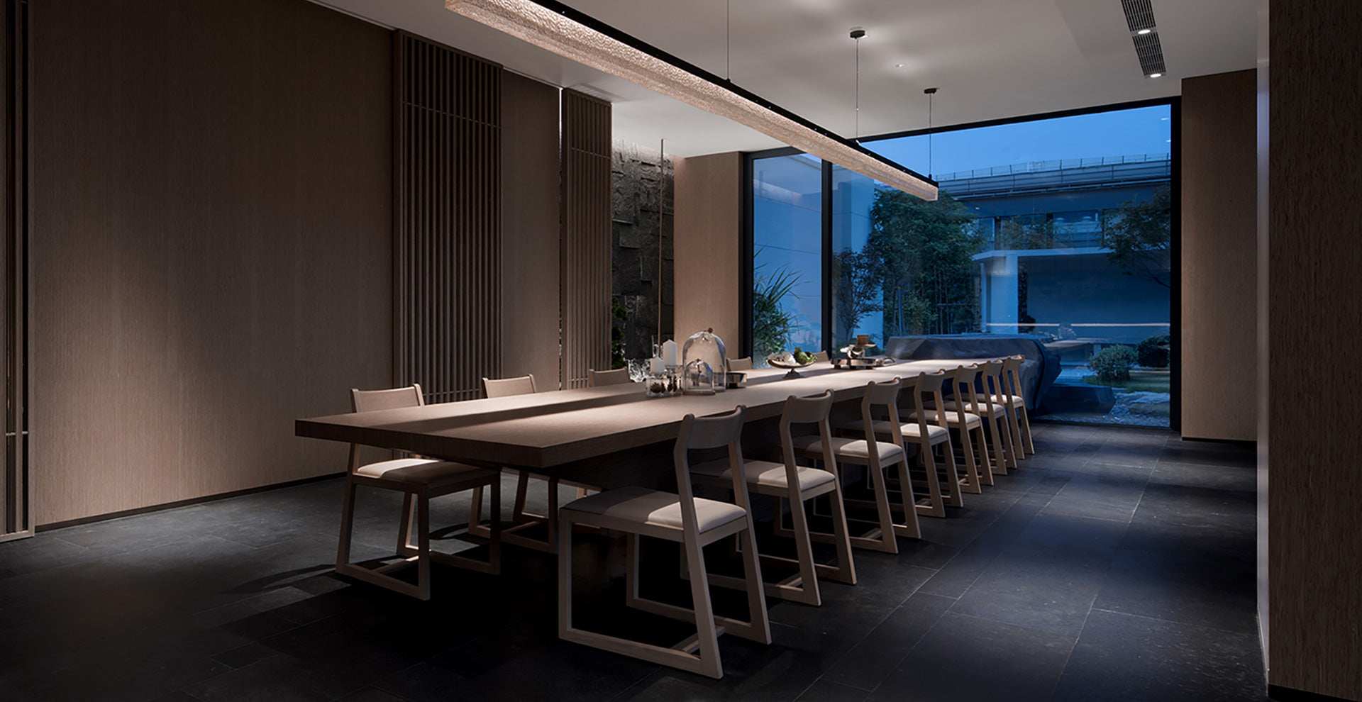 All'interno della club house, tavoli da pranzo e sedie su misura creano un'atmosfera calda e sofisticata, valorizzando ogni incontro con un perfetto equilibrio tra comfort ed eleganza.