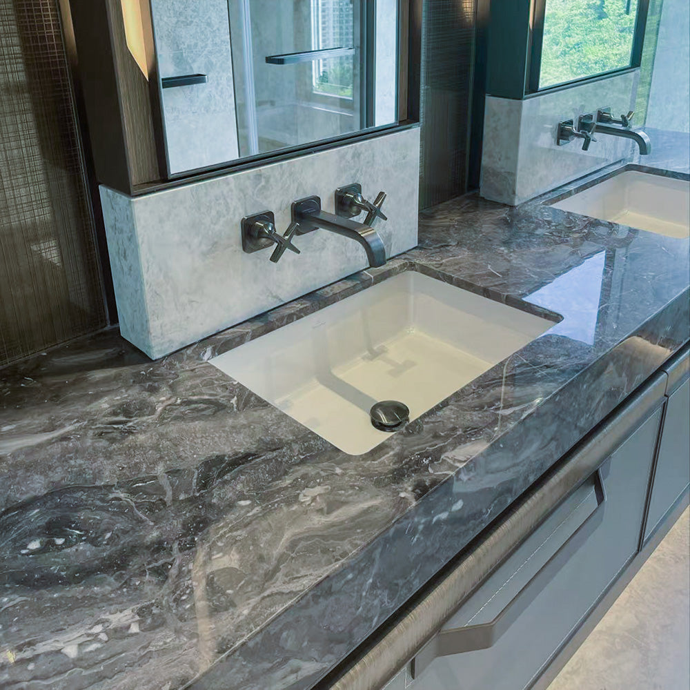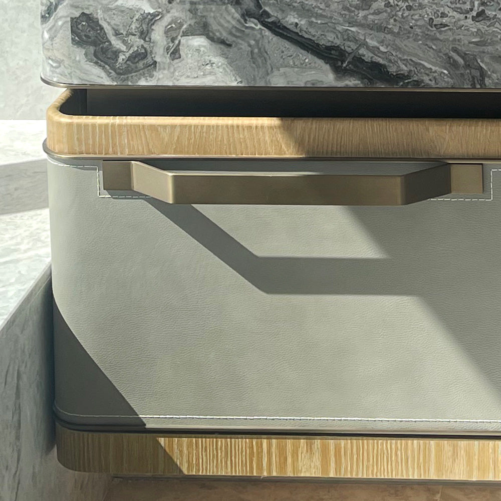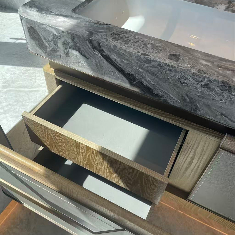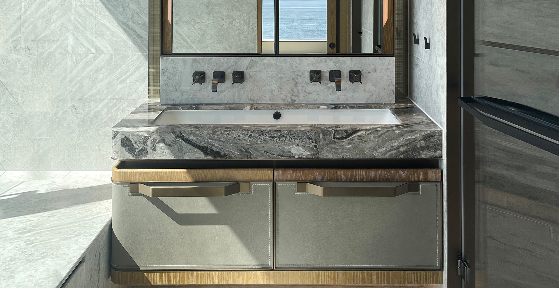 The DILISE DA03 luxury bathroom designs & furniture is designed for premium bathroom spaces. It features a large single countertop basin paired with wall-mounted dual faucets, a natural marble countertop with metal edging, and wall-mounted cabinets finished in wood and leather. Thoughtfully integrated mirrored cabinets and storage solutions achieve a perfect balance of functionality and visual luxury, delivering an ultimate high-end bathroom experience.