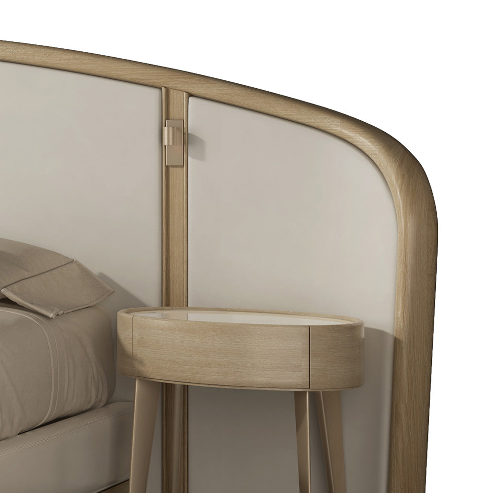 Inspired by classic retro design, the Opera bed features an oversized fan-shaped headboard with expansive, flowing curves. The gently arched sides wrap around the sleeping area, forming a subtle sense of enclosure that enhances privacy and comfort. This sculptural backrest invites relaxation while expressing the elegant restraint and timeless charm of vintage interior design.