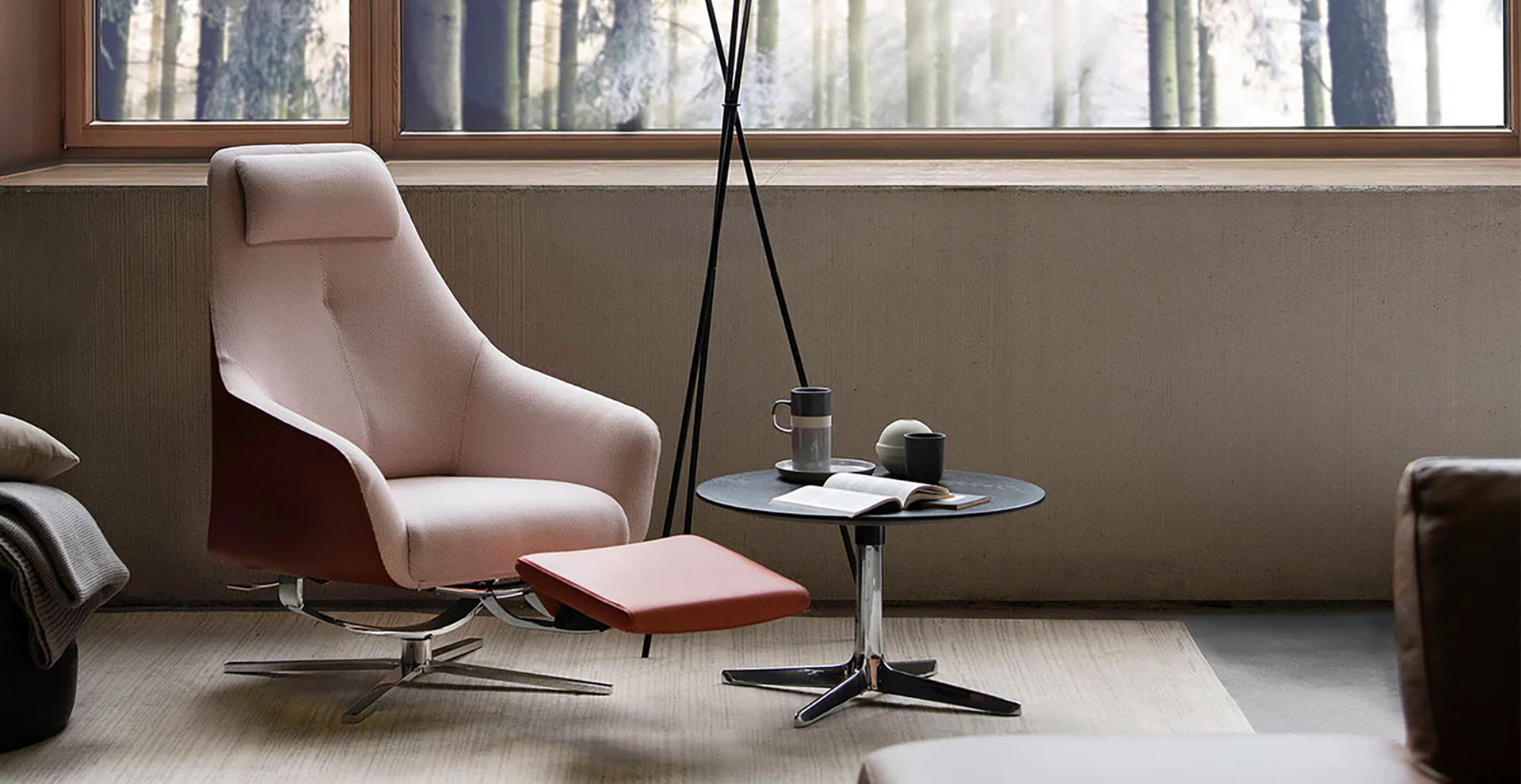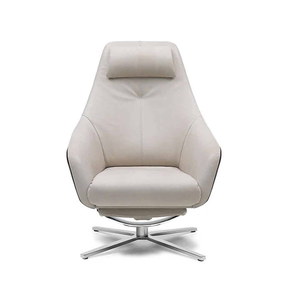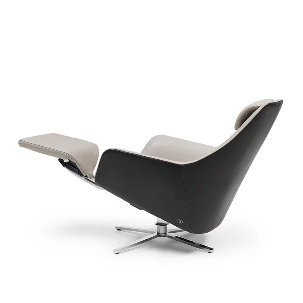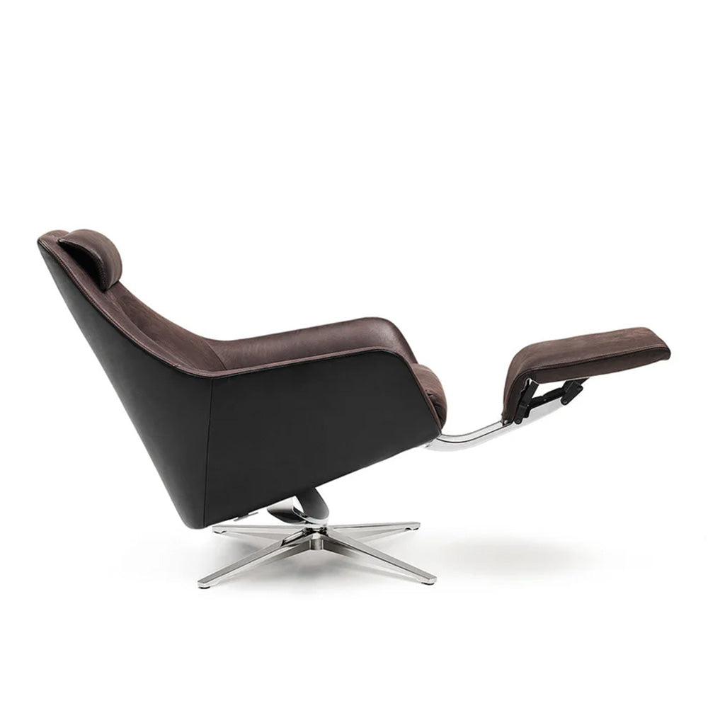 A sleek armchair offering maximum comfort thanks to its integrated reclining function—the backrest tilts and an invisible footrest extends. Its distinctive features include the hand-stitched exterior and the continuously height-adjustable headrest, perfectly combining design and function.