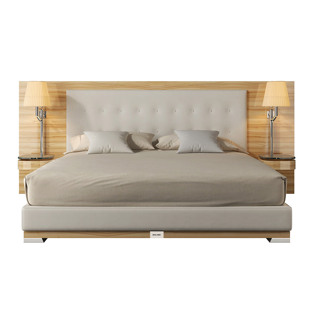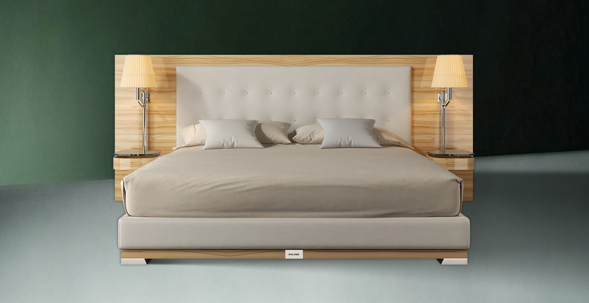 The Dilise Palace DDB 02 is a classic finished luxury bed set designed to bring understated ceremony into modern custom bedrooms. Featuring a full-width wooden headboard with elegant applewood grain, the bed integrates soft leather upholstery for enhanced comfort and visual balance. Optional vintage wall lamps and suspended bedside tables extend both functionality and ambiance, making Palace DDB 02 a versatile centerpiece for refined bedroom interiors.