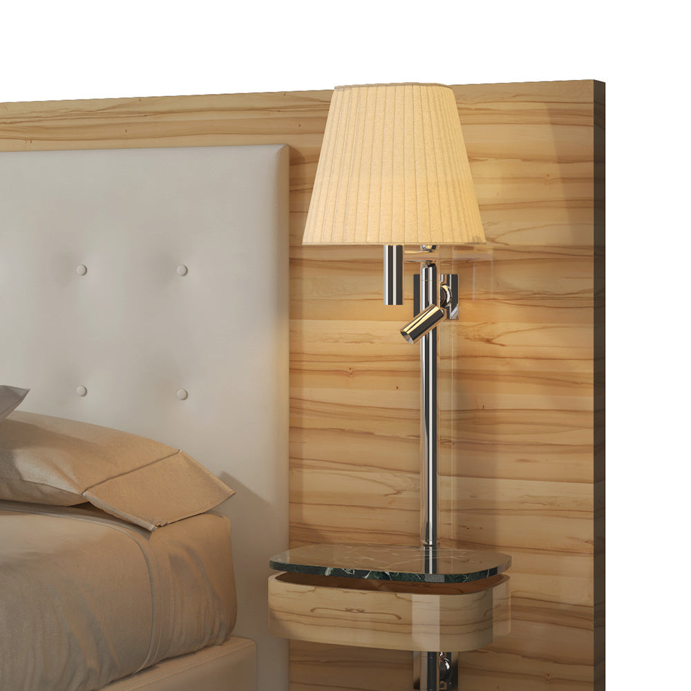 Optional vintage-style wall lamps enhance the bedside ambiance with soft, warm illumination, infusing the bedroom with classic elegance. Floating nightstands with durable stone tops provide practical space for personal items like cups or diffusers, while their staggered arrangement enriches the spatial layering and overall aesthetic harmony.